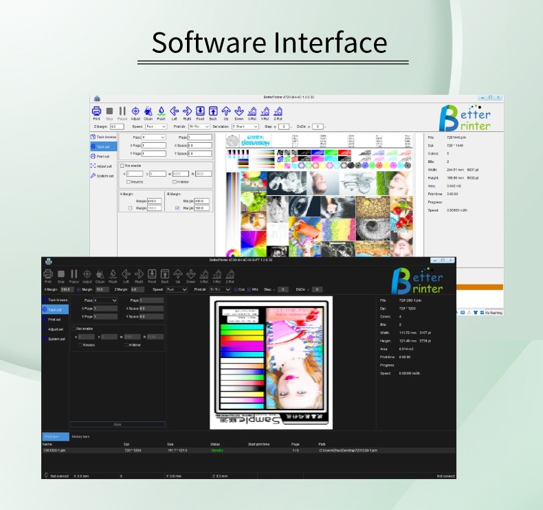 System sterowania drukiem atramentowym w postaci włókna USB2.0, model dyszy aplikacyjnej: TX800, podłączony przez kabel światłowodowy, o szybkiej prędkości transmisji.Dostępne są dojrzałe rozwiązania do druku atramentowego w maszynach fotograficznych, drukowanie płaskości UV, drukowanie cieplne w tekstyliach, drukowanie transferu folii tekstyliów i bezpośrednie opryskiwanie dwustronne.