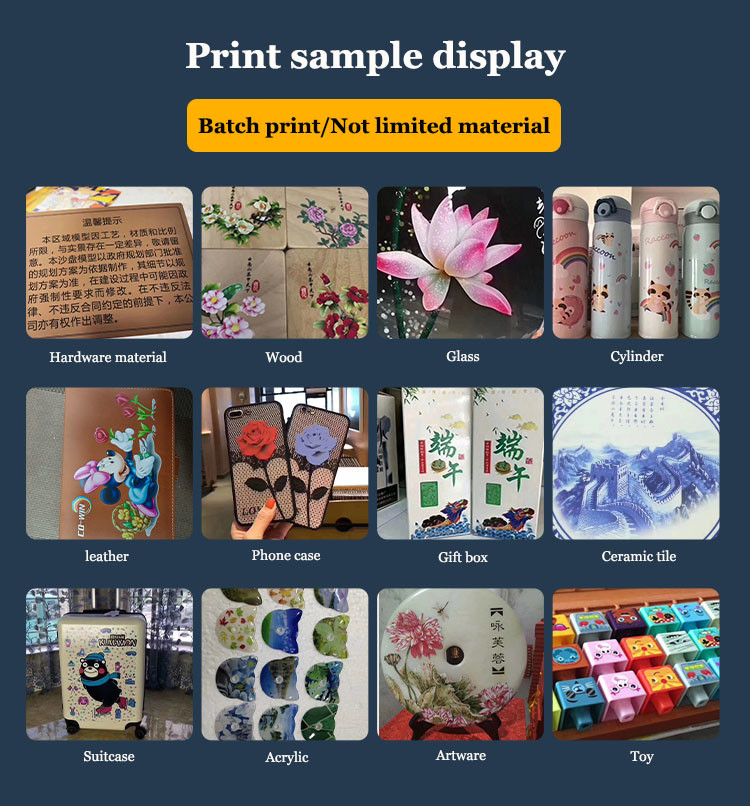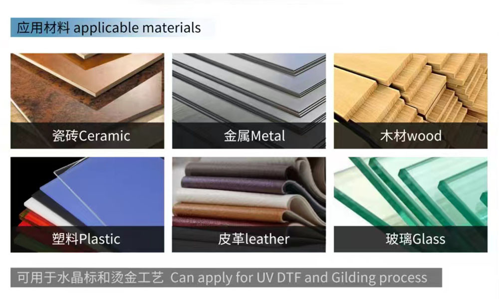 Materiały do zastosowania w druku UV: PVC, folia odblaskowa, płótno, dywan, skóra, szkło, płytki ceramiczne, metal, sufit, aluminium, drewno, drzwi, płyta akrylowa, pleksi, płyta piankowa, tektura falista itp.